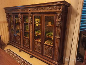 Vendo mobili d'arredo per studio legale/notarile. Composizione: antica libreria composta da tre ante in vetro a piombo cattedrale in stile rinascimentale. Manufatto a zampe di leone ricco di fregi e scanalature. Scrivania in legno e tre sedie foderate in pelle con rilievi. Prima metà del Novecento. Tutto in noce massello. Mobilia in ottime condizioni, non usurata né tarlata.