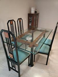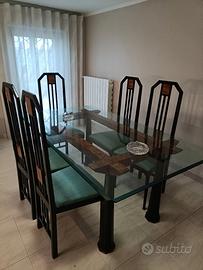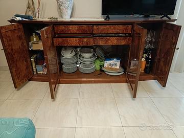 Arredamento classico composto da vetrina a tre ante in radica e mensole in vetro tavolo con gambe in radica e vetro con 6 sedie mobile basso con doppia cassettiera centrale sempre in radica in ottimo stato vendo per inutilizzo prezzo da concordare