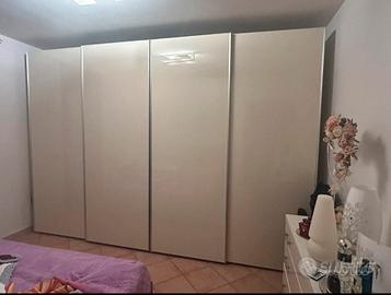 Armadio scorrevole 4 ante laccato bianco lucido. In due ante vi sono 3 cassetti. Lunghezza totale 3 metri e 70 centimetri altezza 2 metri e 59 centimetri profondita 90 centimetri.