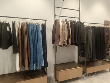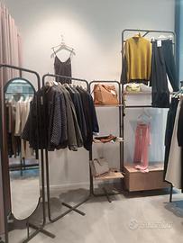 vendo arredo negozio abbigliamento completo di 14 stendini espositivi da cm 82 / 124 , banco cassa rivestito in laminam , banco contenitore lungo cm 160 con cassettoni , pedane per vetrine con manichini , camerini prova , scaffale parete 225x260 con contenitore