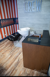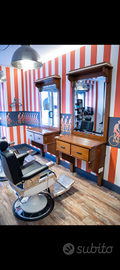 Occasione imperdibile!! Arredamento barber shop in ottime condizioni!! Composto da: 2 poltrone barber David American crew; 1 lavaggio Maletti; 2 postazioni di lavoro con mobile e specchio divisi, specchio larghezza 89 e con i due cassetti sotto altezza 2,20 e larghezza mobile 91; 1 mobile retro al lavaggio con lavandini in acciaio e rubinetto ; 1 mobile da esposizione con due ripiani - altezza 1,32 - larghezza 85 - profondo 30; 1 mobile con ripiani e porta scopa altezza 2,30 - profondo 30 - largo 50; Prezzo trattabile Ritiro e trasporto a vs carico