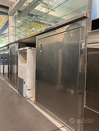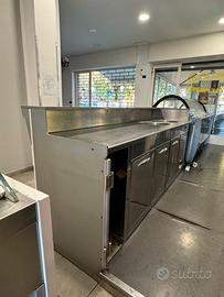 • Retro banco in acciaio inox: robusto e pratico, con vani refrigerati e spazi ottimizzati per la conservazione e la preparazione.
