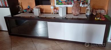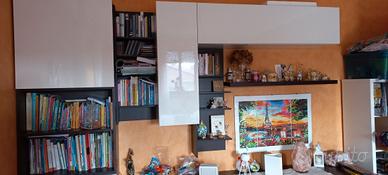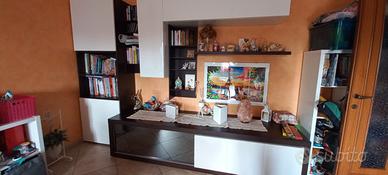 Vendo arredamento completo salotto in wengè e vetro composto da: tavolo in vetro bianco (misure 160x90 allungabile) con 6 sedie in similpelle, mobile basso per tv con 3 cassetti (misure 216x56x43), madia (misure 240x62x55) con due ante scorrevoli,una in vetro ed una in similpelle bianca, con 2 cassetti ed un carrello porta bottiglie estraibile, una colonna con due ante e due scaffali (misure 72x40x218), due pensili laccati bianco lucido (uno con apertura vasistas, misure 36x40x108 e 36x40x144)), mensole varie che si possono montare come più piace.