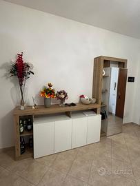 Arredo soggiorno composto da parete attrezzata/mobile TV, divano e cappottiera a specchio. Ambiente accogliente e funzionale.