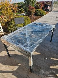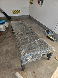 1 tavolo con struttura in alluminio e piano in vetro. 6 sedie in alluminio con seduta in tessuto tecnico. 2 lettini con struttura in alluminio e tessuto tecnico.
