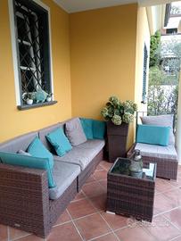 Due lettini regolabili, divano a tre posti componibile, poltroncina, tavolino con piano in vetro apribile da un lato, break con 6 sedute.e piano in vetro. Tutto con con cuscineria sfoderabile