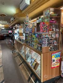 bancone edicola di circa 5 metri con retro banco edicola con mensole vetro e luce a led