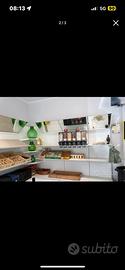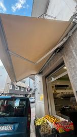 Scaffalatura per fruttivendolo con bancone in noce e tenda da sole