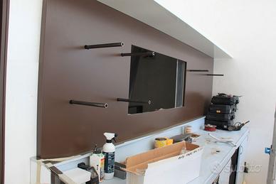 Vendo Banco cassa da 80 cm in legno laccato con piano in lacobel da 1 cm di spessore; Porta laccata con vetro; schienale in legno laccato con vetro vista laboratorio e mensole d'appoggio laccate bianco lucido. Il colore dell'arredamento è marrone laccato (per l'esattezza colore testa di moro) + Pedana di calpestio in legno rivestita in gomma antisdrucciolevole da 3 metri.