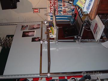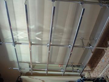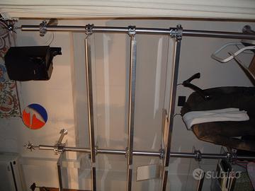 arrdamento in alluminio scaffalatura con ripiani compresi 2 mnichini appesi con rotaie scorrevoli piu sali e scendi specchio con ruote spostabile arreda circa 50 metri