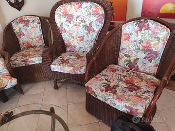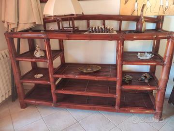 Vendita in blocco arredamento in bambu costituito da: 1 divano letto 2 posti 1 mobile a giorno 3 poltrone con cuscini sfoderabili 1 tavolino da fumo tondo con telaio in bambu e ripiano in vetro Ritiro a proprie spese