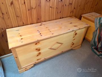Vendo arredamento in legno massiccio: Letto a castello 200€ Baule cassapanca grande 400€ Baule cassapanca piccolo 200€ Comodino 90€ Vendo anche in blocco a 800€ Misure su richiesta.