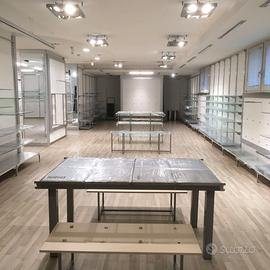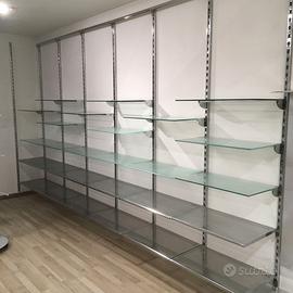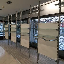 Vendo Arredamento Moderno cromato lucido e vetri satinati ,con cremagliere da parete H.2,50 e ripiani da 65cm. o 1 mt. Barre portabiti e tutti i suoi vari ganci per appenderia di varie misure .Tutto In perfette condizioni , pari al nuovo .Disponibili 50 mt. di parete a prezzo da concordare in base ai mt. che servono e quali accessori . (tel. 3473734482)