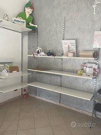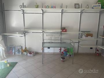 Arredamento modulare in legno bianco . Componibile a proprio piacimento in base alle esigenze. Composto sia da mensole che da appenderia frontale / laterale . Tavolini in vetro da esposizione compreso Ideale per negozi o cabina armadio.