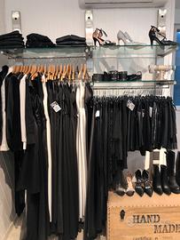 Arredo completo per negozio di: staffe e impalcature a muro spesse in acciaio inox, mensole in vetro temperato, Tavoli in acciaio e vetro, mensole espositive bianche da muro e bancone espositivo con cassetti in acciaio e vetro illuminato sulla parte frontale. Due camerini con tende. Sono dispobili foto e layout in blender per comprendere la disposizione ed eventuale adattamento.