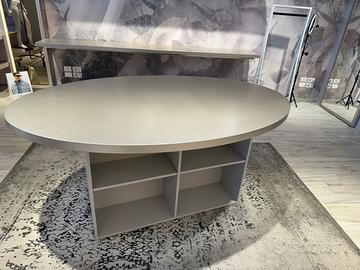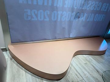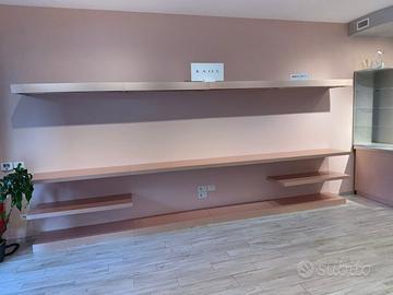 Bancone,blocco 4 camerini in legno con specchio,tavolo con ripiani ,39 mensole componibili ,5 pedane vetrina ,struttura 3 elementi