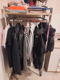 vendesi arredamento per negozio d'abbigliamento formato da 2 mobiletti con vetro da centro negozio, 1 fronte vetrina, 1 mobiletto per vestiti e 3 metri di scaffalatura legno e vetro.
