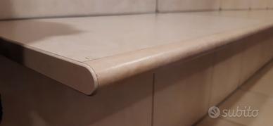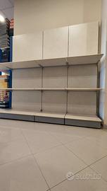 Arredamento negozio in legno laminato composto da 19 moduli verticali a 4 ripiani (15 da cm 100 + 4 da cm 80), 9 gondole bifacciali con 2 ripiani da cm 100, banco cassa da cm 100 e 4 cubi per seduta. Ideale per negozio calzature ma adattabile anche ad altri usi. Valuto vendite a lotti