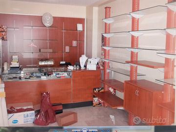 Vendo arredamento negozio con circa 60 mensole di vetro bombate ,Banco e retrobanco illuminato.pwr info 3388221350
