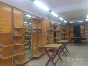 Arredamento negozio Sisley, tutto il legno, elementi modulari composti da ripiani in legno di diverse misure, 4 tavoli + un tavolo vendita grande con vetrina esposizione, tre grandi specchi, aste per appenderia.