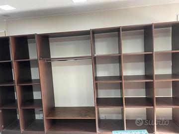 L'armadio è composto da numerosi scomparti quadrati e rettangolari, con un'area più ampia dotata di un'asta appendiabiti.