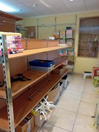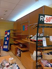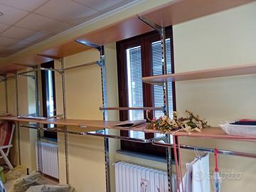 arredamento completo di ex negozio di abbigliamento composto vari pezzi tutto componibile a vostro piacimento: mensole, ganci assortiti (dritti, storti, corti e lunghi), barre per appenderla, gondole, tavolo, cassettiere.