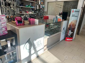 - Bancone di vemdita legno e vetro illuminato nella parte frontale; 2 cassettoni e 4 mwnsole nel retro