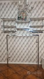 Bancone per cassa, 5 nicchie in legno in varie misure, stand per appesi e mensole, 4 lampadari, 5 cassettoni/ mobili, banco in metallo e vetro, ecc. In vendita in blocco o singolarmente