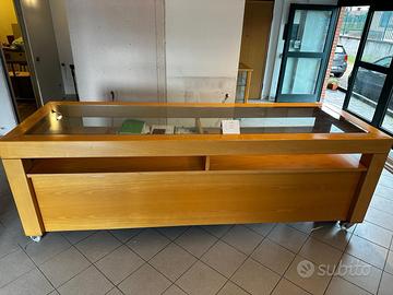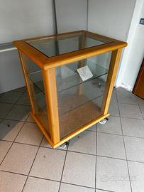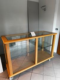 1 Banco da lavoro in legno massello e vetro, con rotelle per facilitare lo spostamento