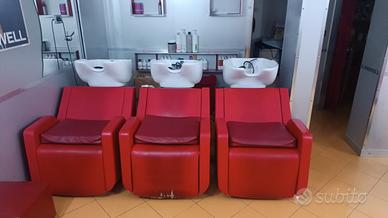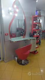 vendo arredamento negozio rosso completo di sedie specchi postazione per postazione,vasche bancone,tutto cio che vedete nelle foto