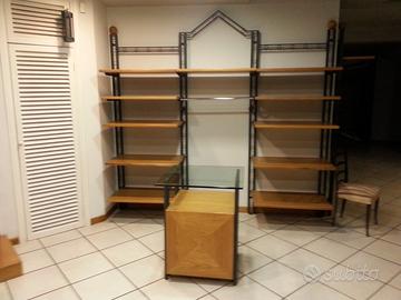 Arredamento negozio ottimo stato disponibile in varie metrature con montanti in ferro martellato e ripiani in legno multistrati con banchi in legno e appoggi in vetro