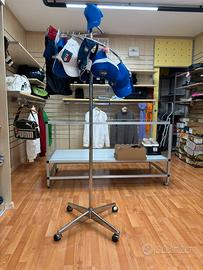 Vendesi arredamento negozio di abbigliamento in ottime condizioni. Super occasione per chiusura locale. Composto da: -Bancone cassa -3 tavoli espositivi -4 espositori porta abiti/merce -3 manichini interi donna, 2 interi uomo e 3 da parete mezzo busto -3 teste da cappello -mensole -appendi abiti da parete