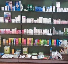 Vendo arredamento per negozio, ottimo per farmacie, parafarmacie, erboristerie o profumerie, composto da diversi pannelli a muro, con rispettiva base, con vari scaffali intercambiabili in cristallo e 4 cassettiere. Formula visto e piaciuto, non spedisco, ritiro su Roma