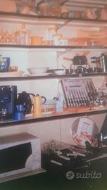 Arredamento negozio elegante con ripiani vetro e legno illuminato. Aggiunta di scaffali modulari color panna tipo supermercato con piani facilmente spostabili. Casalinghi servizi piatti e bicchieri posate soprammobili e stoffe. Completo per negozio liste nozze e articoli regalo chic con tutti i componenti di marchi molto famosi