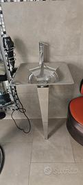 2 sedie di attesa azzurro polvere , 6 specchi verticali con mensole , 3 poggiapiedi, 1 specchio orizzontale , 6 mensole di vetro , 5 cassettiere a due cassetti , poggia phon a muro in acciaio, due lavandini cromati alluminio, mobili cubi a giorno