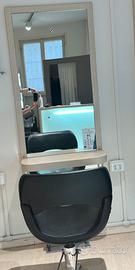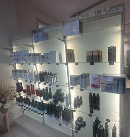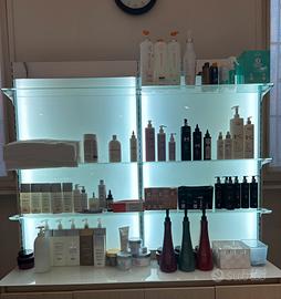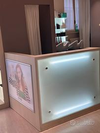 Vendo arredamento parrucchieri : 1 cassa illuminata 6 postazini da lavoro con specchio e poltrone 3 espositori illuminati 1 armadio porta oggetti