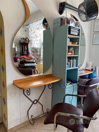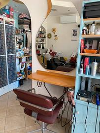 3 specchiere realizzate su misura in legno di ciliegio, con mensola, poggiapiedi e porta phon + 3 comode poltrincine rivestite in pelle.