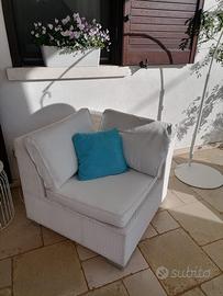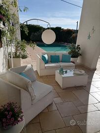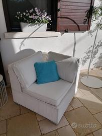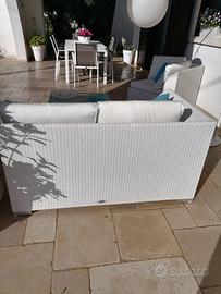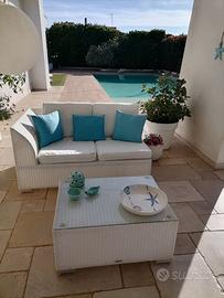 Vendo divani per esterno con cuscini e con tavolini annessi, composto da un biposto, e tre poltrone. Questo set ha la possibilità di diventare componibile.