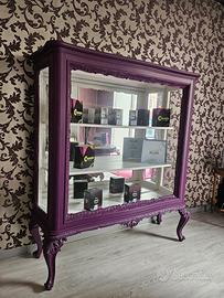 Due scaffali ikea con decorazioni sul bordo. € 150 2, 4 espositori da muro €50 tutti , 1 mobile antico trasormato per esposizione € 300, 1 tavolo del1800 €500