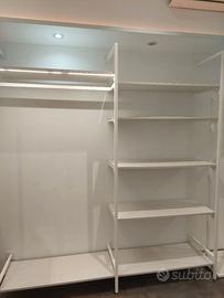 Arredamento per negozio di abbigliamento composto da moduli di un metro di larghezza per 220 di altezza, componibili fra loro e ancorati a parete. La struttura è in ferro laccato bianco e gli scaffali sono in laminato effetto legno colore bianco. La parete composta come da foto è lunga 5 metri, totale dieci metri.