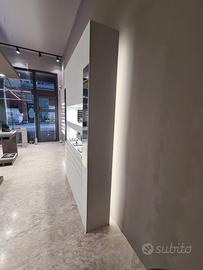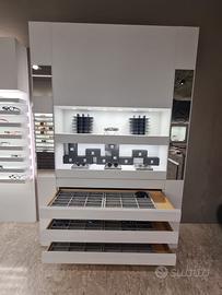 2 mobili in legno illuminati, retroilluminati, contentivi ed espositivi uguali con l'unica differenza che uno ha le cassettiere e l'altro ha lo spazio contenitivo per gli astucci, cataloghi ecc, le misure sono h250x46x170