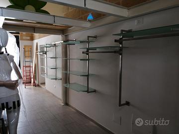 Arredo per negozio abbigliamento in acciaio satinato quadrato da cm 2,5 composto da 22 montanti da 120cm, 56 supporti per mensole in alluminio, 9 aste per appenderia in acciaio da cm 0, 90, 1 asta per appenderia in acciaio da cm 0.60 , 28 mensole in vetro satinato da cm 0.80 x 0,40. L'arredo montato sviluppa 15 mt. Eventuale spedizione a carico dell'acquirente. Ottima soluzione per realizzare una cabina armadio.