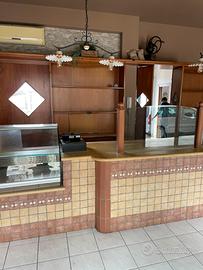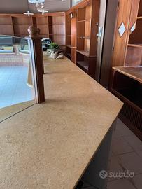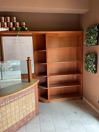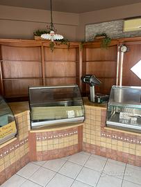 Vendesi arredamento completo per panetteria ( come da foto ) composto da retrobancone in legno massello ( 10 moduli ) rastrelliera per pane , piano in marmo , tre vetrine frigo , un frigo soprabanco per salumeria , luci soprabanco complete di fili elettrici vintage in corda , corpo illuminante sospeso in ferro con piante sintetiche .