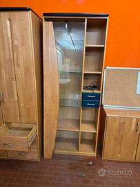 Armadio con due ante e tre cassetti, armadio vetrina con mensole in vetro, mobiletto e scrivania con portapenne.