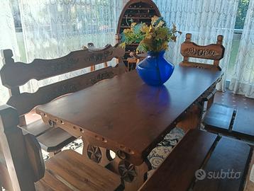 Vendo arredamento completo rustico ideale per taverna o casa di montagna composto da credenza finemente lavorata tavolo allungabile panche sedie tutto in legno massello in ottime condizioni come nuovo