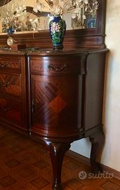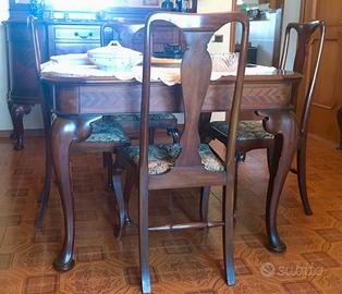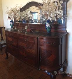 Due buffet, di cui uno con 6 cassetti centrali. Tavolo quadrato fino a 8 coperti. Con le due prolunghe la capienza puo estendersi fino a 12 coperti. I mobili sono in perfetta conservazione, le 8 sedie richiedono intervento alla tappezzeria.