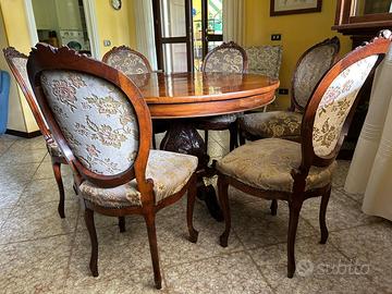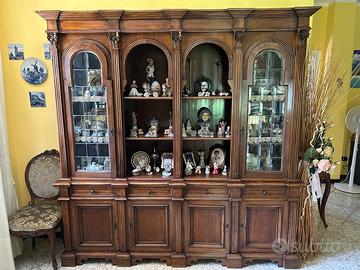 Arredamento sala in noce massello lavorat formato da monile vetrina con vetri molati di dimensioni cm 215 lunghezza, cm 47 larghezza e cm 222 altezza; tavolo rotondo diametro cm 120 e 6 sedie rivestite in velluto damascato; una angoliera e mobile porta televisore
