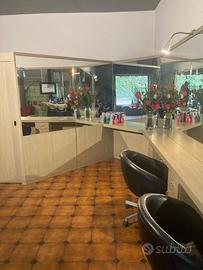 Vendesi arredamento per salone parrucchiera composto da: pannelli con specchi, luci, cassettiere, poggiapiedi, prese elettriche e poltroncine. Pannello angolare con specchio e pannello con porta scorrevole integrata. Presso trattabile