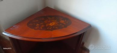 Angoliera e tavolino abbinati da salotto, in legno massello color mogano, con intarsio da sistemare. Sono entrambi realizzati da mobilieri d'arte con decenni di esperienza