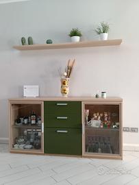 Arredamento completo soggiorno composto da parete attrezzata, madia, divano letto 2 posti e tavolino che si solleva e diventa tavolo da pranzo. Colore rovere sbiancato e verde oliva.